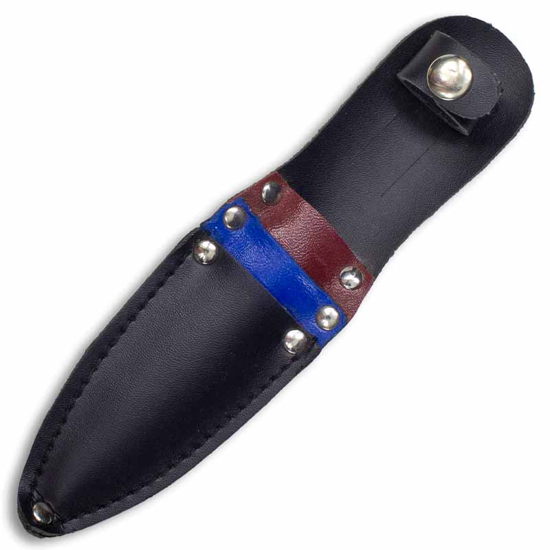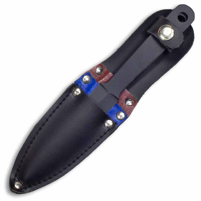 Each black-coated stainless steel knife in this set of three is just about 7 1/4" long and weighs approximately 1 oz. They are sharp, double-edged, and ready to throw. These knives are balanced, which tend to have more predictable rotations and offer more flexibility. They are durable enough to last, but cheap enough to not break the bank before you've even committed to this whole kunai throwing thing. This three piece throwing knife set comes with a black nylon sheath that includes a belt loop, so you can securely store your knives when not practicing.