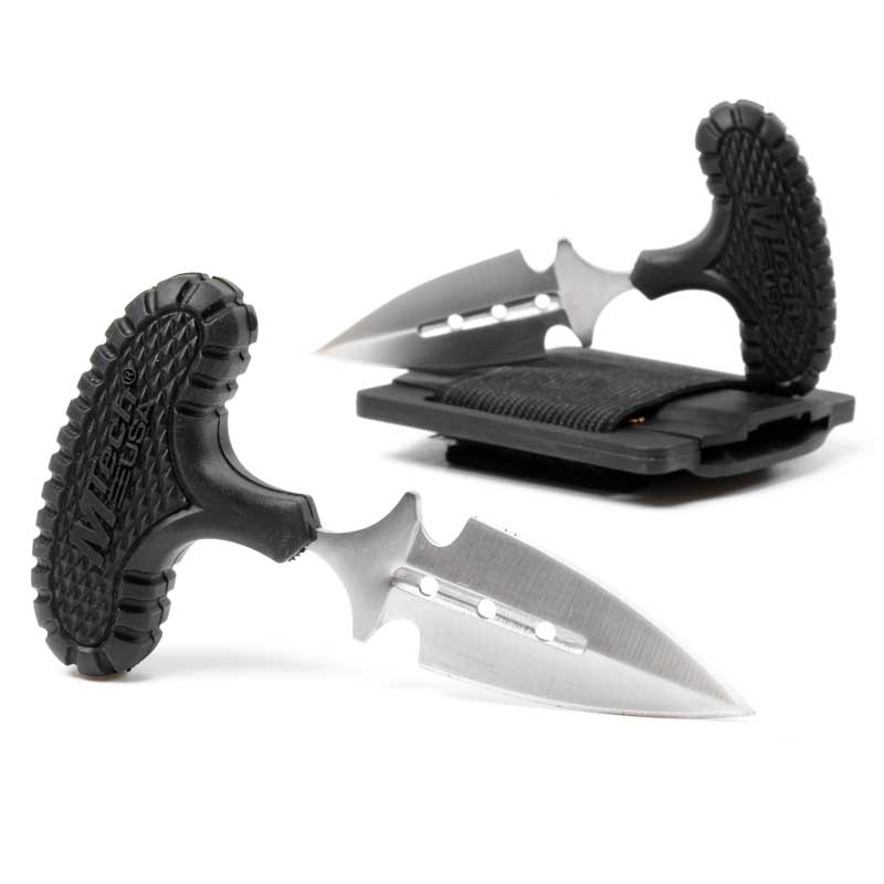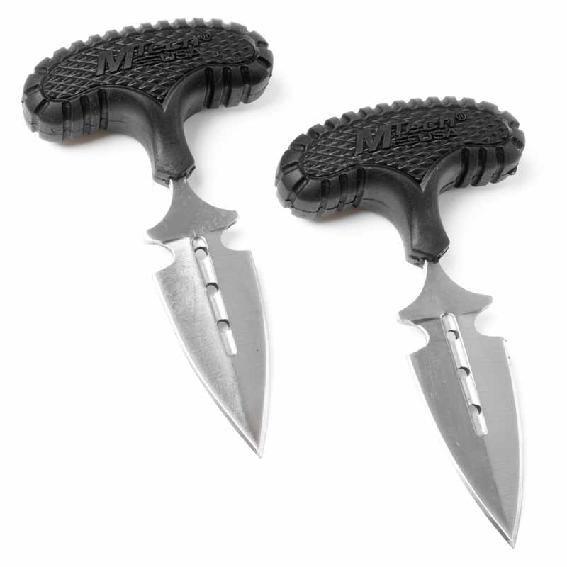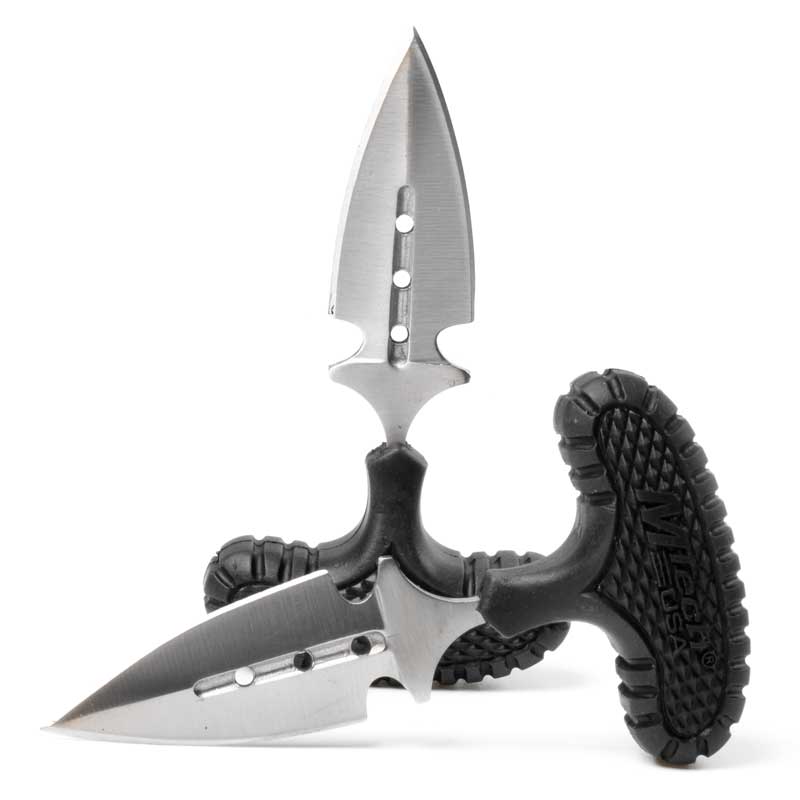 This pair of push knives gives each of your fists extra jabbing power when engaging an attacker. While gripping the horizontal handle, these t-shaped knives fit comfortably in your fists. The triangular 1.75 inch blade pokes from between your fingers, sharp on both edges and coming to a point. As intuitive to wield as your own two fists, these punch daggers are ready to deliver piercing stabs and punishing swipes along with your strikes! The sharp dagger blades are crafted from stainless steel, a durable, corrosion resistant metal. Constructed from solid rubber, the 2 inch handle has a texture to improve grip, enhancing your weapon retention as you defend yourself against your opponent. This double push knife set includes two 3.75 inch long fist knives, one for each hand. With a piercing blade behind your punches, you can deter your attacker with something more than a mere empty fist!