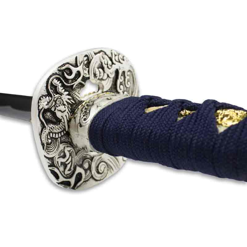 When gripping the handle, or tsuka, you'll feel in control of all 2 pounds 5 ounces of this sword. The tightly wrapped navy blue cord tucks the synthetic white ray skin into place around the wooden handle securely, even with swing after swing during your defensive maneuvers. Also attaching the layers of the handle to the wood underneath are the menuki pendants, or brass-colored dragons that sit one on each side. They comfortably fit in between the corded handle wrap to still give you a flush connection no matter where you hold on to.