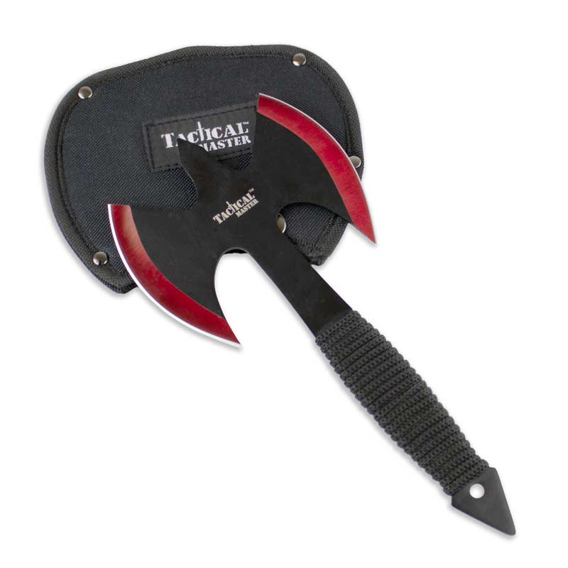 The Dark Fury Throwing Axe is a powerful tool. The standout red anodized finish on the blade isn't just for show; it reflects the quality and durability crafted into every detail of this weapon. Center-balanced for effortless throwing, this axe also features two 4-inch razor-sharp edges, delivering reliable performance with each strike. The paracord handle makes it ideal for extended practice sessions, giving you secure, non-slip handling. Finished with protective spikes and packaged with a custom-fitted sheath, this throwing axe is ready to add impact to your collection, training, or costume.