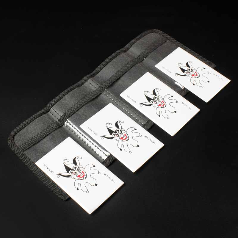 With a sinister joker image on the face of the throwing card and a white card back, these throwing blades show that you aren't here just to play for fun. Constructed from stainless steel, each of these 1.4 oz throwing cards is durable and resistant to corrosion and rust. Each card is 3 3/8" x 2" and fits snugly into its sleeve in the black nylon carrying case. The case has a convenient belt loop, closes securely with its Velcro closure, and weighs just 6.8 oz while holding all 4 cards, so you can carry this throwing cards set just as easily as you'd carry a deck of cards!