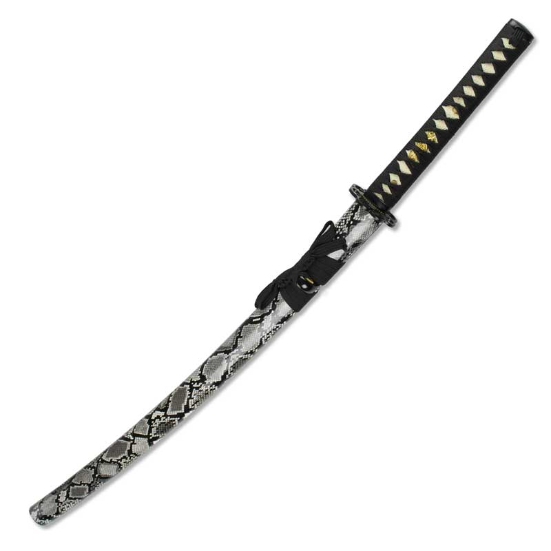 Weighing only about 3 pounds total, this snake skin katana is a beautiful display piece that will also function just fine as a way to bite intruders in your den. The synthetic scabbard cover of a monochrome diamond-back rattlesnake is high quality and stitched tightly together around the wooden saya. The hand guard of these fine swords is a curled black metal that creates negative space while still protecting your fingers. Send a message to those around you that an encounter with you could result in a dangerous curse, or worse, a stinging bite!