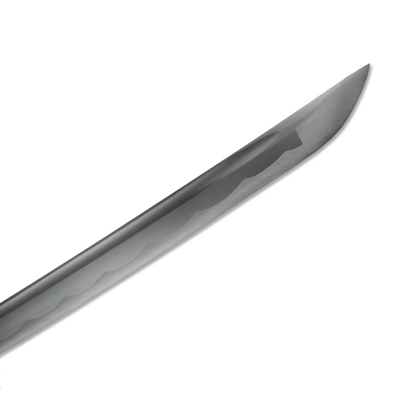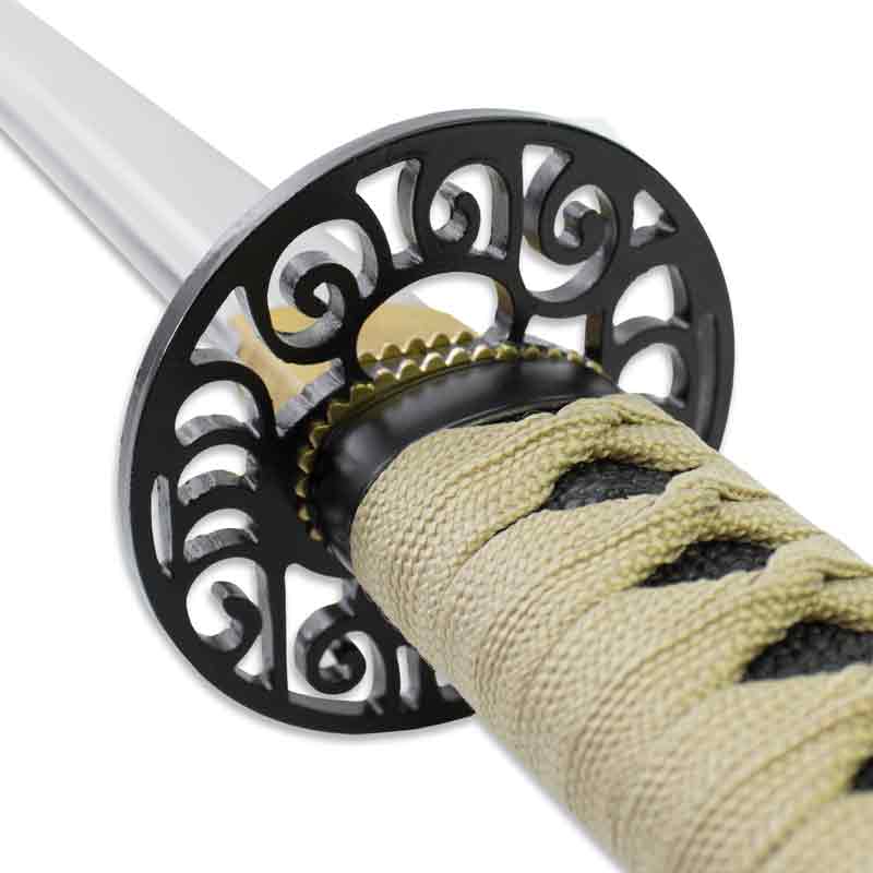 The craftsmanship of this samurai sword begins with a full tang 1045 high carbon steel blade that is straight as an arrow and sharp as can be. The traditional outward katana curve of the blade gives you more surface area to slice with, about 28 inches worth. The aesthetic hamon line is added for the taste of the swordsmith, and there are deep fullers added to each end of the spine. The brass-colored habaki makes sure that this full tang blade stays in place as it carries down to the handle.