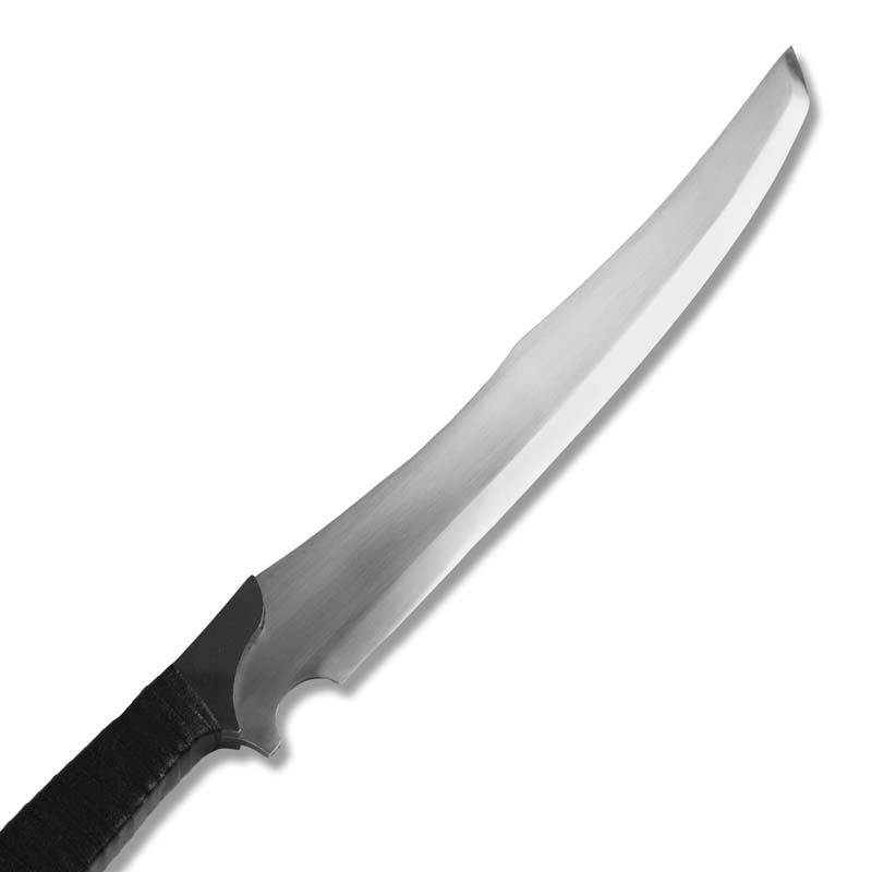 The blade of this polearem is basically a machete on it's own, but add about 25 inches of black polyurethane-wrapped handle, and you have a weapon that can slice through the entire platoon if you wanted to. The fine edge is razor sharp, and it has a thick black faux leather sheath to protect you and others from getting cut during transport or storage. The tang of this single-piece sword reaches down to the pommel, showing the slabs of spring steel used to create this legendary two-handed sword.
