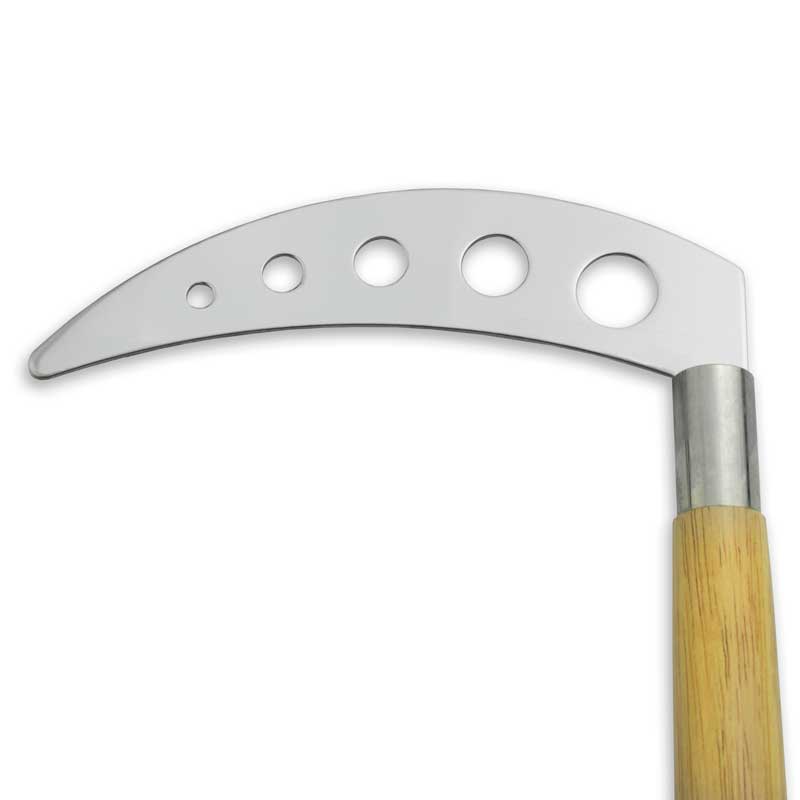 These classic kamas have a smooth wooden handle with a natural blonde stain that really brings out the beauty of the wood. The vented chrome blades have a dull edge so you can practice and perform without getting sliced. These kamas also have a cord loop at the bottom of the handle to hang them up for storage or put around your wrist to prevent slippage during extreme demonstrations. The handle length is approximately 12" and the blades are approximately 7".