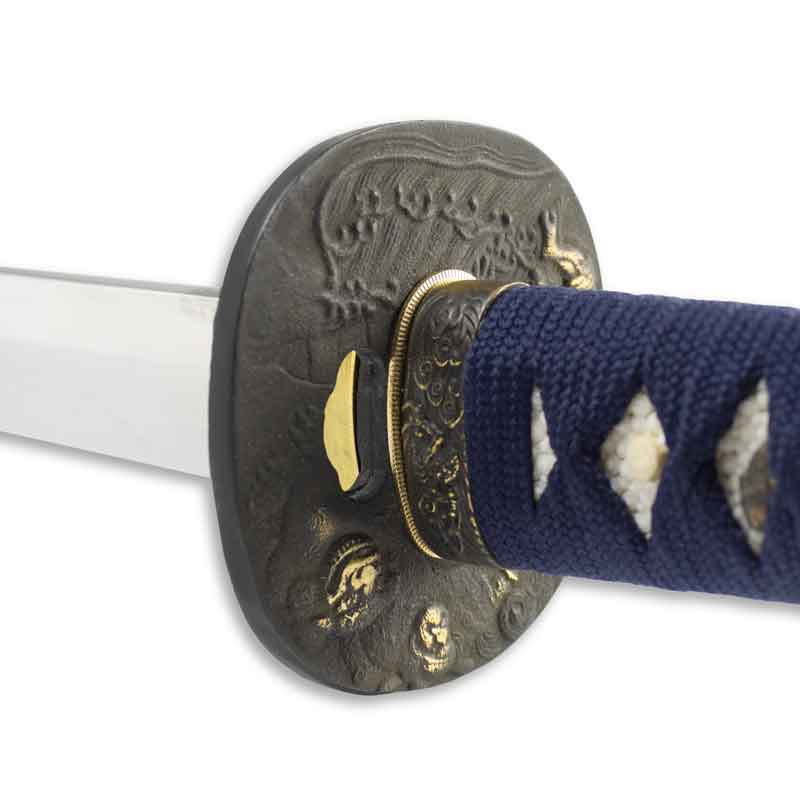Keeping with the high quality of the full-tang metal, this katana has an elegant tsuka, or handle. A wooden grip is carved to match the curve of the blade, and then covered with a layer of authentic white samegawa, or ray skin. This traditional layering prevents the woven cord wrap of the tsuka-ito from being disturbed during use. Gripping onto the dark navy wrapped cord will allow you to lift and swing this 2 pound 9 ounce samurai sword around until you've completed your practice for the day. The tsuka is also decorated with a dark bronze menuki figurine on each side, offering some cosmic protection to the wielder of this Japanese-style fighting sword.