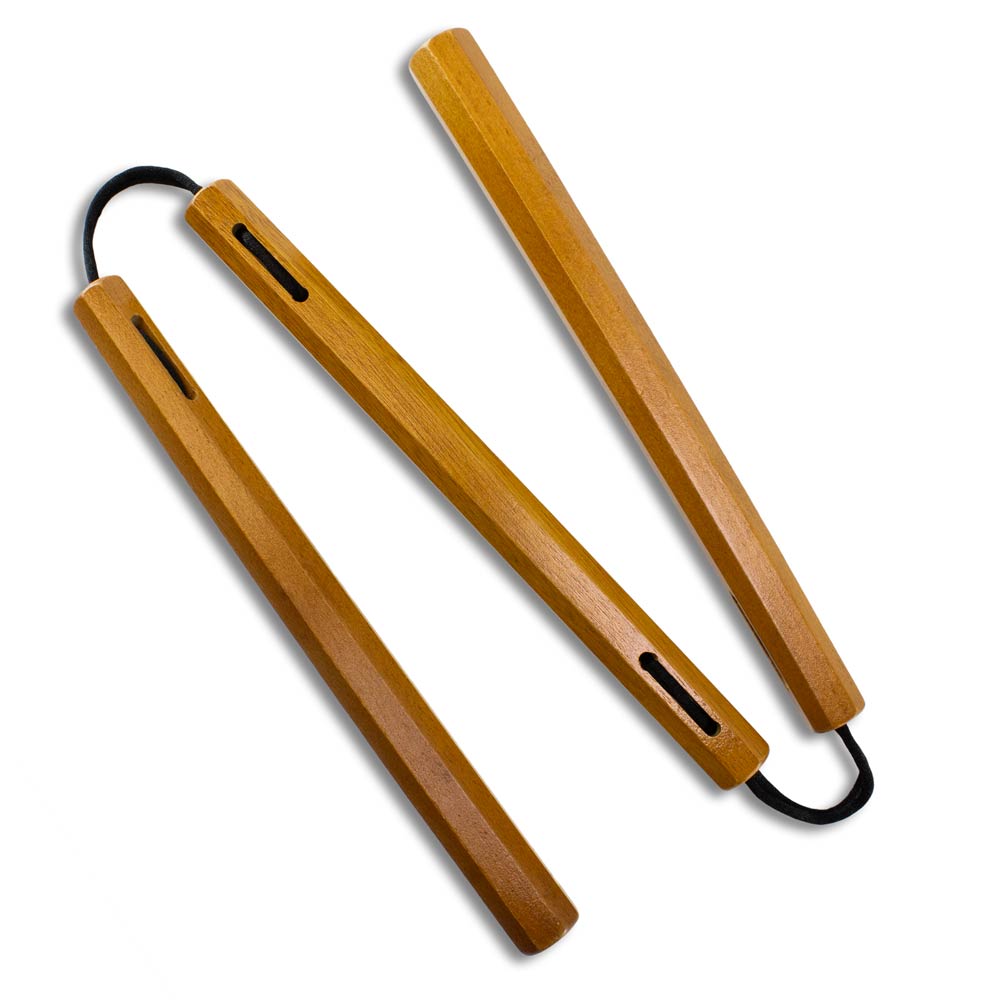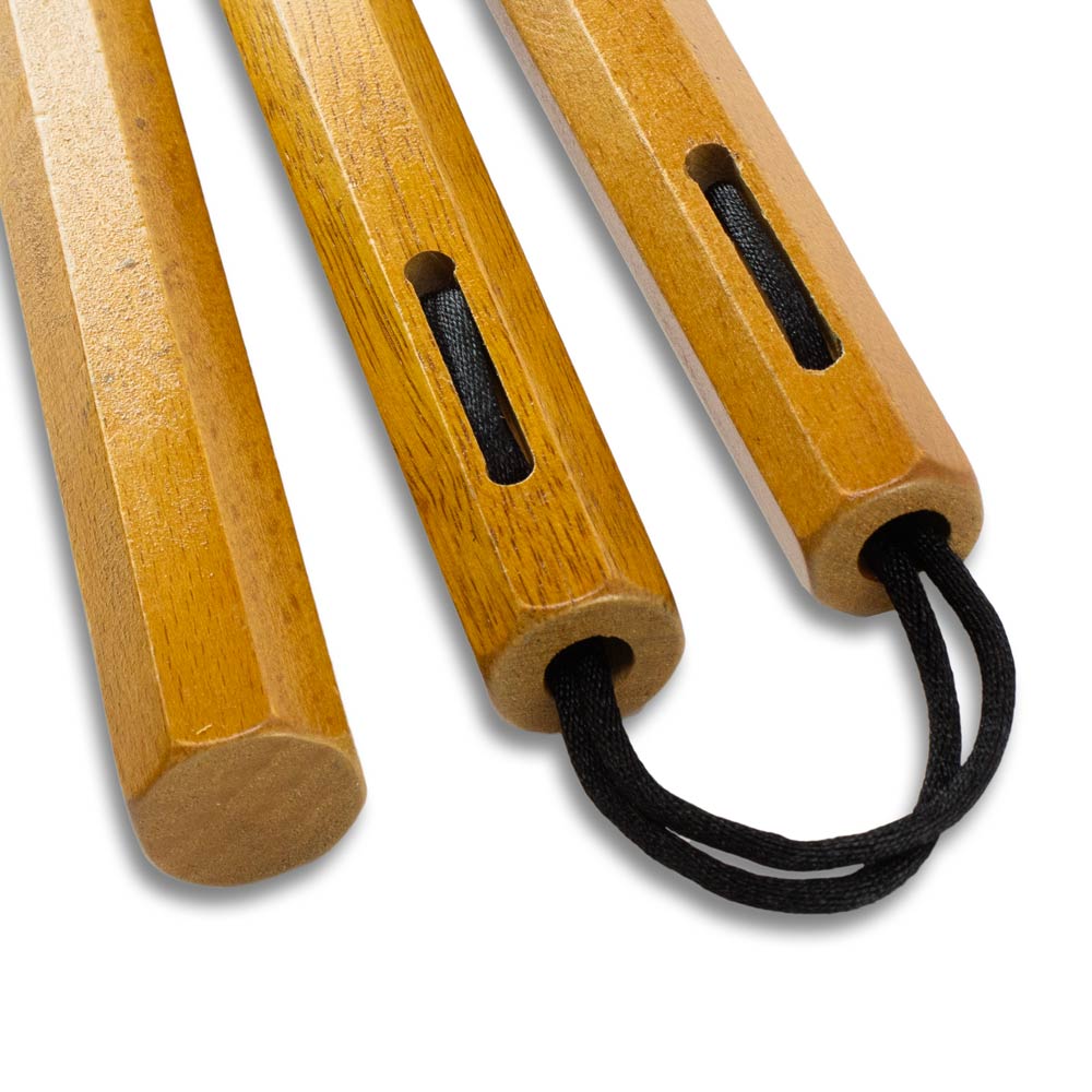 The San Setsu Kon is a traditional kung fu weapon that offers a diverse range of possibilities for the martial arts enthusiast. Each of the three pieces of this triple nunchaku are 14" long, carved into the ergonomic octagonal design, and hooked together with a black metal cord.