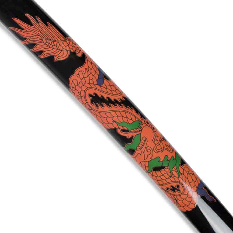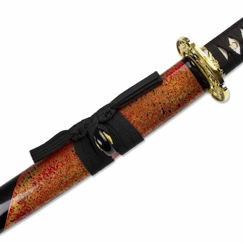 The saya that houses the carbon steel blade is wooden with a black lacquered coating. A red dragon drawn in a traditional style is added near the bottom of the scabbard, while an intricate red and lacquered gold section is added near the top at the black sageo wrap. Fitted in the scabbard, this katana reaches about 41 inches long, so it will look great fitted on your wall with the black, gold, and red combination showing the sophisticated design.