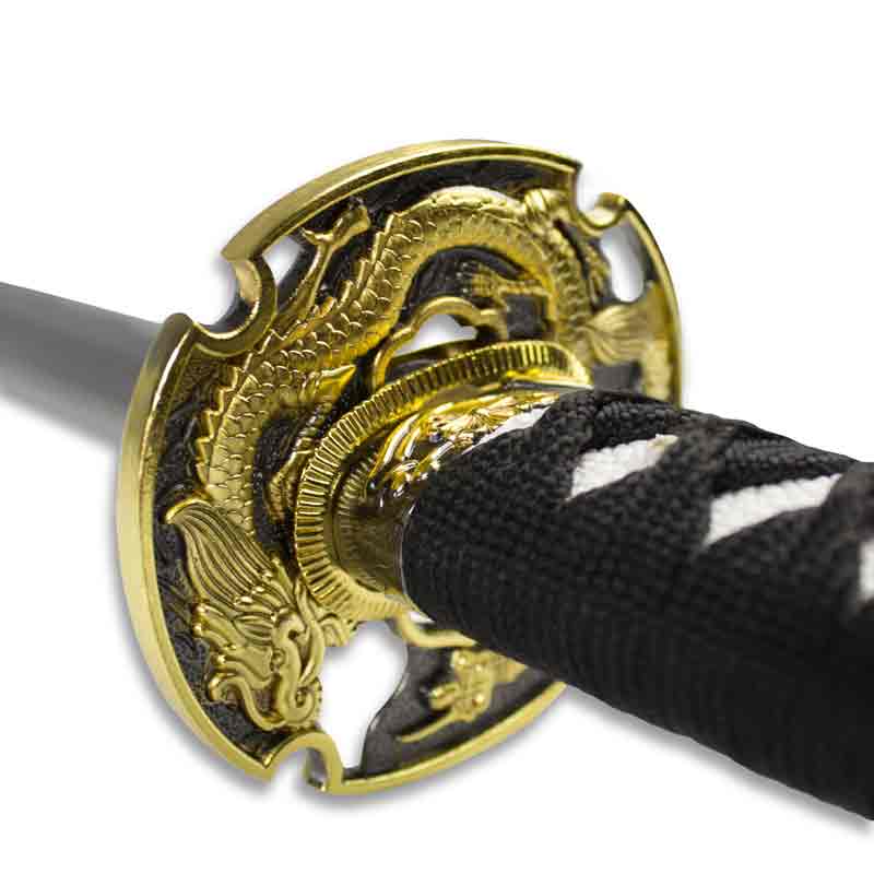 The scabbard meets the sword at the tsuba, the elegantly embossed handguard that serves as protection and as artistic expression. This guard is made of a metal alloy that is coated to be black and gold with an detailed scene of warriors fighting a dragon. This piece of the katana complements the hardwood handle that is first covered in synthetic ray skin and then wrapped with a black woven cord in a tsuka-ito. This pattern has diamond holes that show the ray skin and the dragon menuki that secure the layers together. The wood pegs on the handle show how this samurai blade is full tang for long lasting use.