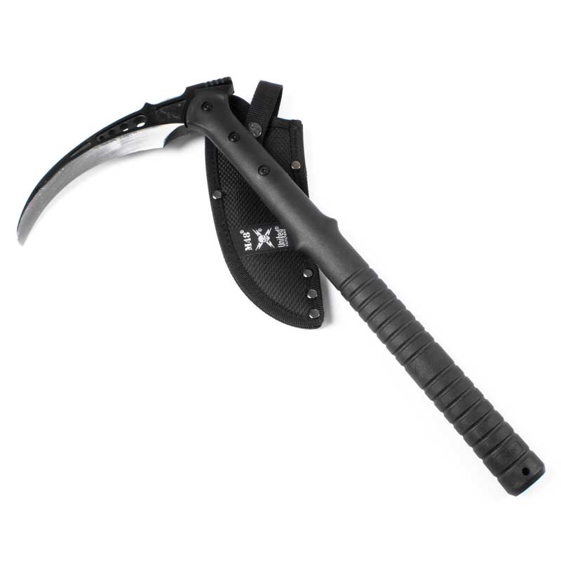 This tactical scythe comes with a black nylon sheath to keep the sharp blade safe when not in use. This durable cover keeps the blade safe from damage, and others safe from injury. Protecting your heavy duty weapon is as easy as sliding the blade into the kama case and securing the head with the nylon strap by snapping it closed. The tough nylon is difficult to pierce and reinforced with a strip of high density foam along the bottom edge where the blade's edge sits. The seams of the sheath are reinforced with nylon edging and heavy duty stitching to reduce wear and tear.