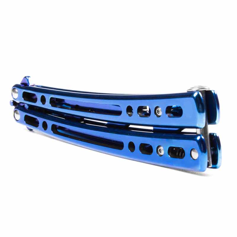 Have you been feeling blue? Then pick up a new skill to build confidence and finger dexterity! Drilling a new move should not leave you covered in bandages, so why not start with the safe option? Few trainers look cooler than the Vented Blue Butterfly Trainer, with the tanto cut of the unsharpened blade and solid steel parts. Flap these handles around to brush your blues away!