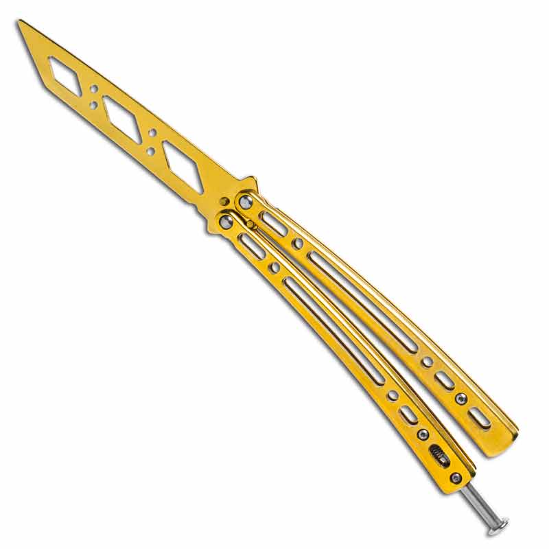 It could be time to pick up a new hobby or work on your finger dexterity. What better way than a lethal fan knife? Well, an unsharpened practice knife first! You want a dull steel blade that will have the same weight and shape as the sharp counterparts. So you want this Vented Gold Butterfly Trainer!